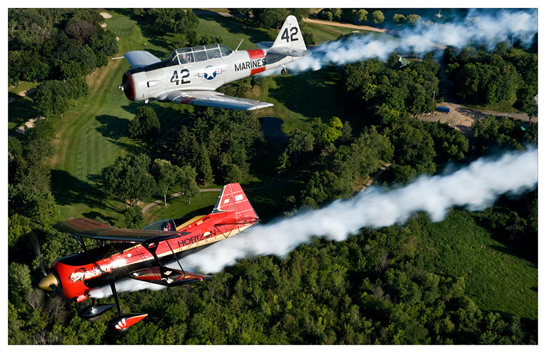 | Hey! We have an interloper! Bruce Olson and his T-6 happened to be in the neighborhood, so-to-speak, so he formed up on us for an orbit.  Bruce and I have an ongoing mission to photograph him with every plane in the sky-- expect an essay on that later. |  |