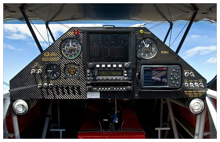 | The cockpit: very simple and direct, with plenty of glass. I'm skeptical of the fancy backplate, I wonder if that ever gets distracting when you're upside down in the middle of an airshow manuever... Hmm, and since the plane is built for one, I wonder if the sign on the lower right says-- "PASSENGER WARNING, SITTING ON THE TAIL CAN GET VERY WINDY, HOLD ON TIGHT".