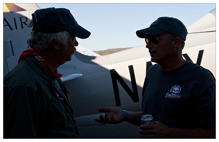 Back in the Sawbones pit, pilot Ray Dieckman discusses the plane's performance with crew chief Doug Weske over a beer.