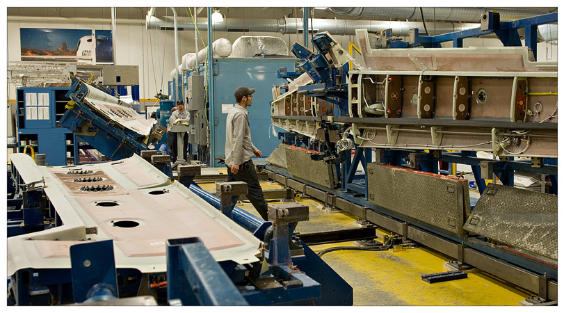 There is the spar, placed into the top section of the wing. This machine clamps the top and bottom of the wings together, and then moves it into a big oven for fusing together.