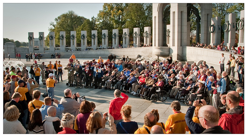 In 2004, 59 years after the war ended, this monument was finally opened. The Honor Flight Network's mission is to bring Veterans to Washington to be at this very spot and witness, first-hand, the gratitude of their Nation for their sacrifices and the sacrifices of their fallen comrades. And when the last WW2 Veteran is laid to rest, there will be flights of Korean War and Vietnam Conflict Veterans. | |