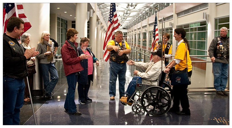 But the party wasn't over. When we arrived, there was a welcoming party. Several Color Guards greeted the Veterans first. A Vietnam Vet reaches out to shake the hand of a fellow Vietnam Vet. He was the lone exception on our flight of WW2 Vets, but his medical situation is precarious, and he wanted to see the Memorials before it's too hard to travel. | |