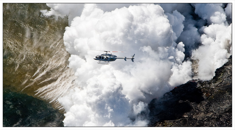 We are not alone. A sightseeing helicopter gets up close and personal as slivers of red hot rock ooze into the ocean, to form more real estate for the tycoons of 3010, to put in another golf course.