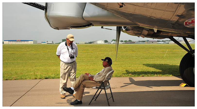 Someone brought him a chair and a bottle of cool water as he waited for a golf cart to take him back to the CAF Red Tail Squadron booth. The folks running the air show know that, like the B-17, he is a WW2 treasure too. To read more about Joe's history, check out the website created by his daughter as a tribute. | |||||