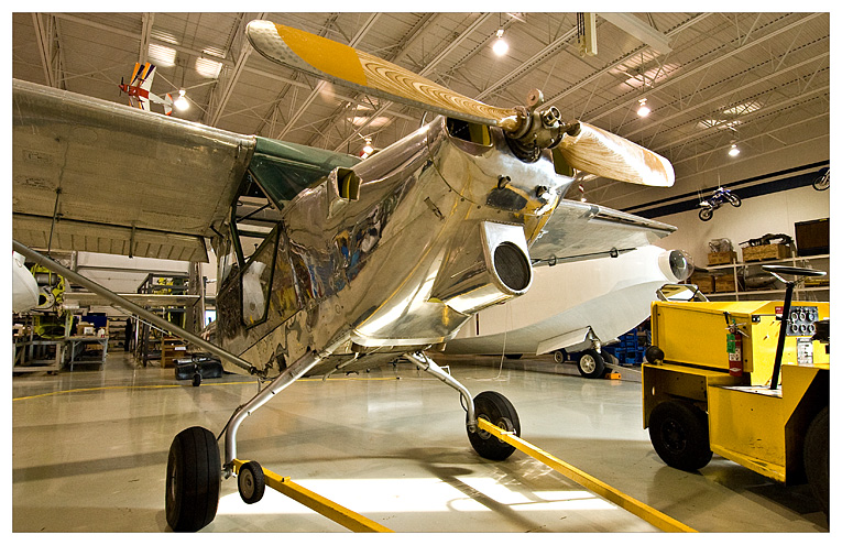 A shiney Stinson/Consolidated Vultee L-13A Grasshopper, also shares the hangar, and a few flying motorcycles.
