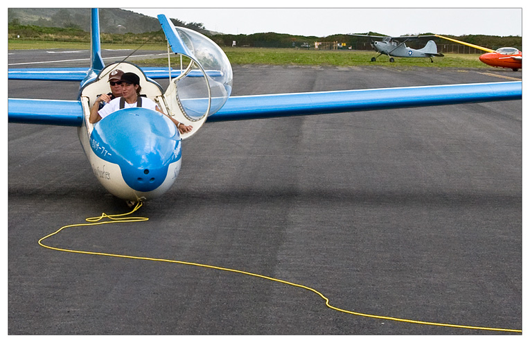 Pilot Meagan Nauman gives last minute instructions to her passenger as we fire up the Ector with the tow rope attached.