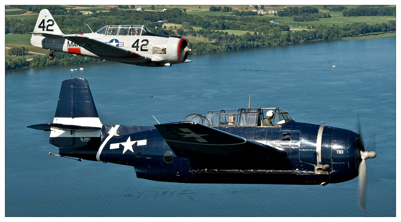 Two WW2 Marine aircraft fly together over the lake. Bruce Olson in his SNJ, with Brad's wife Jane in the back seat, trail Brad and Linda in the Avenger. The TBM is a faster aircraft, with a top speed of 276 mph, compared to the SNJ's 208 mph.